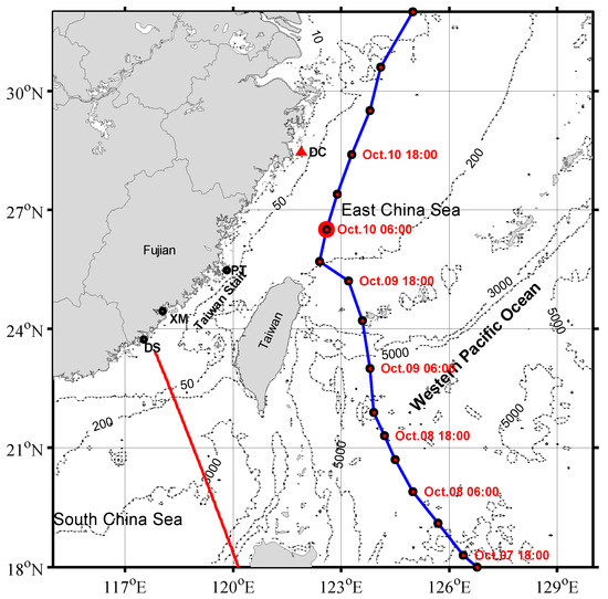 Typhoons often cause storm surges off the eastern and southern coasts of China in summer and fall, for example along the coast of Fujian. Taiwan Strait, connecting the South China Sea and the East China Sea (Figure 1), is a shallow water area between Fujian and Taiwan, with an average depth of about 60 m [14]. The tide is very strong and dominated by semi-diurnal constituents [14,15,16]. Storm surge models have been developed for Taiwan Strait and adjacent waters [16,17]. According to previous studies, the interaction between tide and storm surge is notable, especially in shallow waters where tidal range is large [18,19,20]. In spite of the fact that the region is often hit by typhoons and storm surges, there has been little literature reporting on storm surges observed by satellite altimetry.