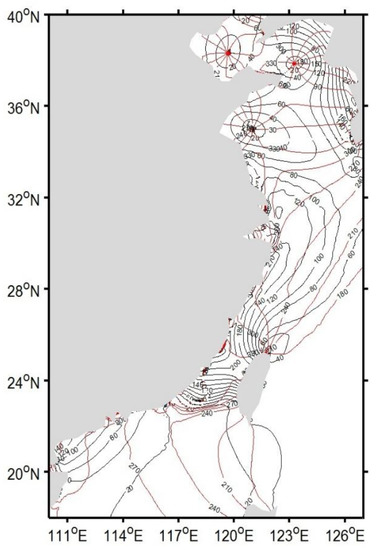 M2 co-tidal and co-phase charts from FVCOM. The red and black lines show the phase lag (in degrees relative to Beijing local time (UT + 8 h)) and amplitude (in centimeters), respectively.