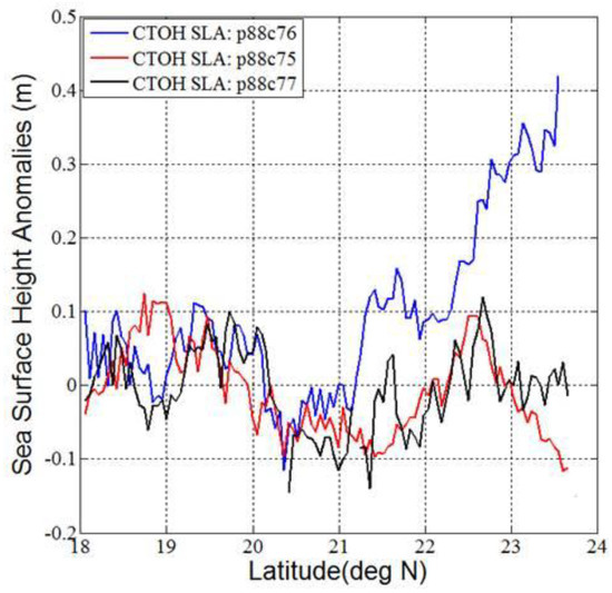 Altimetric sea surface height anomalies along Track 88 observed by T/P. Blue: Cycle 76 during Typhoon Seth. Red: Cycle 75. Black: Cycle 77. CTOH, Centre for Topographic studies of the Ocean and Hydrosphere. SLA, Sea Level Anomalies.