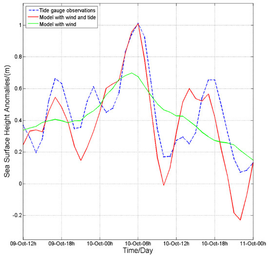 Both model results and tide-gauge data show a significant 12-h oscillation in non-tidal sea level anomalies at the Xiamen tide-gauge station. To understand this oscillation, we have run a model simulation without tides. The model run without tides does not show the 12-h oscillation at all (Figure 8). Therefore, the 12-h oscillation is associated with the nonlinear interactions between the wind-driven storm surge and the tides. The tide-surge interactions in Taiwan Strait were discussed by Zhang et al. (2010) [17], attributable mainly to the bottom friction and advection. In addition, the highest surge of 0.70 m in the simulation without tides occurs about 1 h earlier. At the time of the peak storm surge, the non-linear interactions contribute by 0.34 m (Figure 8) and the pure wind effects by 0.67 m.