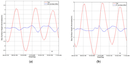 Sea surface height anomalies due to the tide-surge nonlinear interactions and tidal height at (a) XM and (b) PT. The model is forced by both the tide and the NCEP wind modified by 1.3-times.