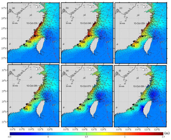 The de-tided model sea level anomalies from 03:00 to 08:00 on 10 October 1994 (Figure 10) indicate a storm surge generated along the coast of Fujian, when the typhoon was located northeast of Taiwan. They also showed a southwestward propagation of storm surge. The sea level anomalies were relatively high near the Pingtan tide-gauge station at 03:00 on 10 October (Figure 10a). The high sea level anomalies propagated southwestward, arriving at the Xiamen tide-gauge station at 06:00 (Figure 10d) and at the Dongshan tide-gauge station 2 h later.
