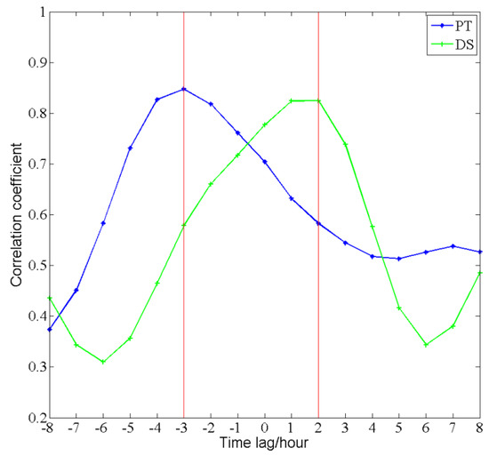 The lagged correlation coefficients of the model non-tidal sea surface height anomalies between PT and XM (blue) and between DS and XM (green). Negative values in the time lag mean the former station leading the latter for each pair. The model run is forced by both the tide and the NCEP wind modified by 1.3-times.