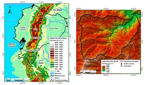 The research area, the San Francisco watershed, is located in the eastern escarpment of the south Ecuadorian Andes between the cities of Loja and Zamora (Figure 1), with drainage into the Amazon Basin. The catchment is part of the Cordillera Real and has an extension of ~85 km2, including the “Reserva Biológica San Francisco” (RBSF) where the research station Estación Científica San Francisco (ECSF: lat. 3°58′18′′S, long. 79°4′45′′W, 1860 m above sea level; Figure 1) is situated. The altitudes range from 1600 m above sea level at the river outlet to 3200 m above sea level at the highest mountain tops [68]. The Andes between southern Ecuador and northern Peru are characterized by lower mean altitudes compared to other parts of the mountain range (Andean Depression, the Amotape-Huancabamba Depression), only reaching 3900 m above sea level at the highest mountains. Therefore, a strong exchange between the Ecuadorian costal vegetation and the Amazon vegetation exists, leading to extraordinarily high biodiversity in this region (hottest hotspot in biodiversity; for example, References [69,70]).
