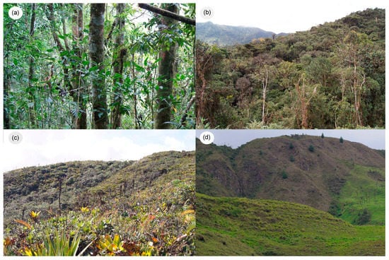 Principal vegetation units in the San Francisco catchment: (a) Tropical Mountain Forest (TMF), (b) Elfin Forest, (c) subpáramo and (d) pasture.