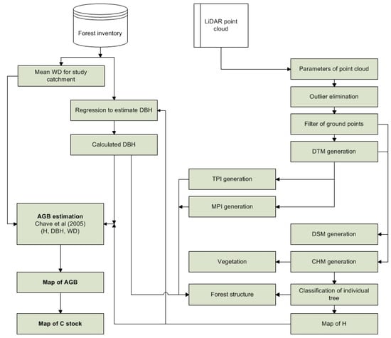 The processing chain to estimate AGB and C stocks of the TMF as well as its distribution influenced by the forest structure is shown in Figure 3. AGB and C stock were only estimated for the TMF and the Elfin Forest by means of the LiDAR data in combination with field measurements, considering only trees higher than 5 m with a DBH greater than 10 cm, as recommended by Li et al. and Gianico et al. [87,88]. For the other vegetation units (pastures and subpáramo) the AGB and respectively C stock values from previous investigations inside or next to the study area were used [89,90].