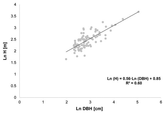 Due to the selective forest inventory (plot based), H and DBH field measurements were only used to establish a height-diameter relationship [92], because obtaining these values for all individual trees inside the catchment is difficult to realize. In general, height-diameter relationships vary significantly between regions because of the species composition and local climate conditions [49]. To determine the local relationship 244 tree measurements were used and the remaining trees sampled were preserved for validation. To the selected H and DBH data a logarithmic transformation was applied, as suggested by Gianico et al. and Djomo and Chimi [88,93] and then a linear regression analysis executed (Figure 4; [94]). The obtained local height-diameter relationship for this TMF is shown in Figure 4.