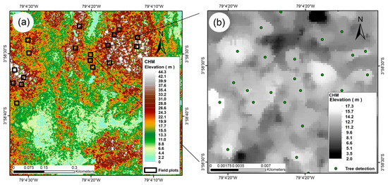 (a) Canopy Height Model (CHM), including field plots; (b) Example of the individual tree classification for one plot in the study area.