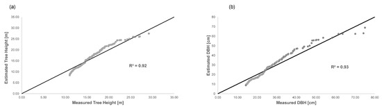 (a) Measured H compared to estimated H, derived from the LiDAR data; (b) Measured DBH compared to estimated DBH, obtained from the local height-diameter relationship.