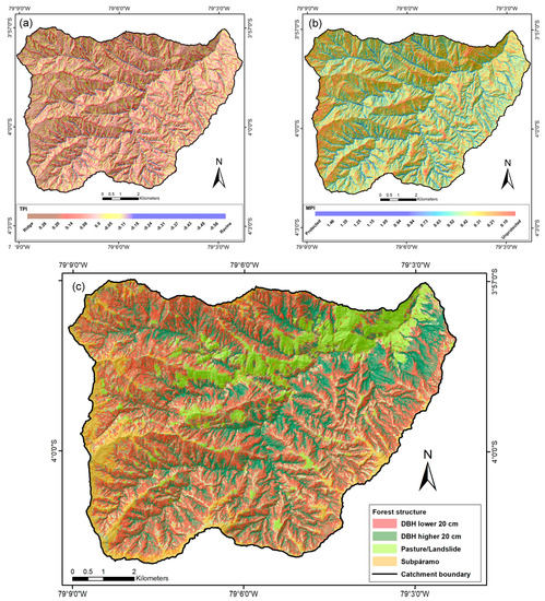 Forest structure detected in the research catchment by means of (a) TPI; (b) MPI; (c) distribution of trees with a DBH smaller than 20 cm (red) and bigger than 20 cm (green).