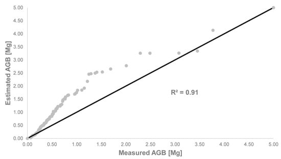 H and DBH are directly correlated to the AGB (Equation (1), [21]) and therefore AGB per tree vary notably within the different forest types. The mean AGB per tree in the ravine TMF was estimated at 0.3 Mg, whereas the mean AGB per tree in the ridge TMF resulted in 0.1 Mg. For the ravine Elfin Forest mean AGB per tree also resulted in 0.1 Mg but for the ridge Elfin Forest a mean AGB of 0.0 Mg was determined. Maximum AGB per tree was obtained for the lower ravine TMF, indicating values up to 47.1 Mg, whereas for the biggest trees in ridge Elfin Forest only an AGB of 0.1 Mg was estimated (Table 2). To evaluate these findings, the estimated AGB per tree were compared to the AGB per tree calculated from the plot data inventory (Figure 8). It is clearly visible that the AGB per tree is generally overestimated, which is mainly due to the applied average WD value, because Werner and Homeier [25] applied the specific WD to each individual tree species and the established local height-diameter relationship, which slightly overestimates the DBH of the individual trees (see Figure 6b). However, the coefficient of determination (R² = 0.91; p-value < 0.001) indicated a very good correlation between measured and estimated AGB values per tree.