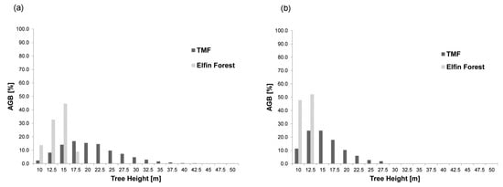 Figure 10 illustrates the percentage of the different tree-height classes respective to total AGB value of the two forest types. In the ravine TMF the trees with heights between 15.0 m and 30.0 m contribute 82.7% of the total AGB (Figure 10a), representing only 48.8% of the trees present there (see Figure 9a). Trees smaller than 15.0 m only add 10.6% of the total AGB, standing for 51.0% of the trees, whereas trees bigger than 30 m account for 6.7% of the total AGB, representing only 0.2% of this forest type. In the ravine Elfin Forest, the situation is similar, because trees bigger than 15.0 m contribute 53.5% of the total AGB, accounting only for 25.2% of all trees present there. Trees up to 15.0 m are most frequent in this forest type (74.8%, Figure 10a) but their contribution to the total AGB is only 46.5% (Figure 9a).