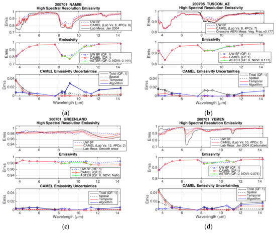 The first site in Figure 3a shows emissivity spectra comparisons over the Namib desert during January 2007. The quartz doublet feature can clearly be seen at 8.5 and 12.5 µm since the desert sands consists mostly of quartz and hematite. In the top panel, the CAMEL HSR product closely captures the depth of the quartz doublet within the 8–9 µm region. The middle panel shows how the CAMEL emissivity is defined using ASTER bands within this 8–9.3 µm window. The difference between the ASTER and UW BF product around 9 µm is reflected in the CAMEL algorithm uncertainty shown in the bottom panel. With an exception for wavelengths less than ~5 µm where the temporal uncertainty is the largest component, the total uncertainty is dominated by the algorithmic uncertainty.