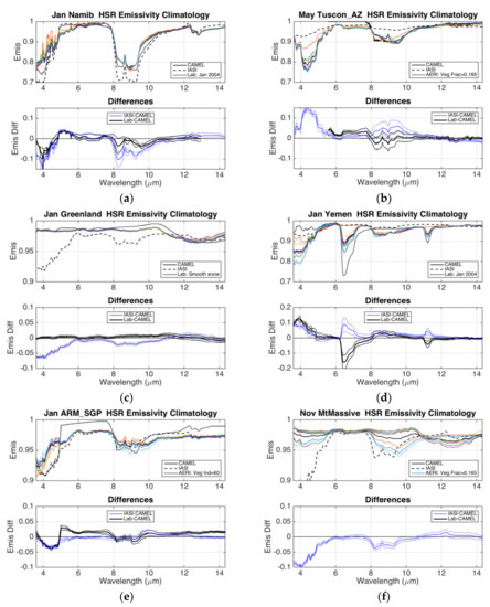 High spectral resolution (HSR) emissivity for (a) January Namib (−24.25N, 15.25E); (b) May Tucson, AZ (32.01N, −110.77E); (c) January Greenland (72.57N, −38.45E); (d) January Yemen (19.15N, 55.57E); (e) January Atmospheric Radiation Measurement, Southern Great Plains (ARM SGP) (36.60N, −97.48E); and (f) Nov Mt. Massive (39.17N, −106.47E) case sites. Top panels show CAMEL 8-year averaged (solid black), lab measurement (dotted black), and Infrared Atmospheric Sounding Interferometer (IASI) 8-year averaged (dashed black) HSR emissivity spectra overlaid on top of the individual CAMEL spectra for the years over which the aforementioned average was computed (colored). Bottom panel shows differences of the IASI minus CAMEL averages (blue solid) and lab minus CAMEL emissivity (black solid) which are both bounded by the CAMEL HSR uncertainty (dotted lines).