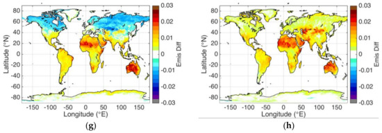 Difference of IASI minus CAMEL 8-year average emissivities at 0.25° × 0.25° spatial resolution for (a) January 3.6 µm; (b) July 3.6 µm; (c) January 8.6 µm; (d) July 8.6 µm; (e) January 10.8 µm; (f) July 10.8 µm; (g) January 12.1 µm; (h) July 12.1 µm. The years for which the 8-year averages are calculated are 2008–2015 for January and 2007–2014 for July. Colorbar limits change from channel to channel.
