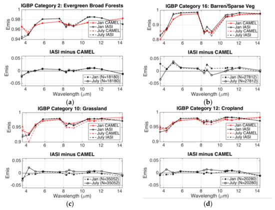 Top panels show IASI (black) and CAMEL (red) 8-year average emissivity averaged over the (a) evergreen broadleaf forest; (b) barren/sparse vegetation; (c) grassland; and (d) cropland IGBP land classifications for the months of January (solid line, circle markers) and July (red line, ‘X’ markers). Bottom panels show the associated averaged IASI minus CAMEL again for January (black dashed ‘X’ markers) and July (black solid circle markers). Number of samples, N, noted in bottom panel’s legend.
