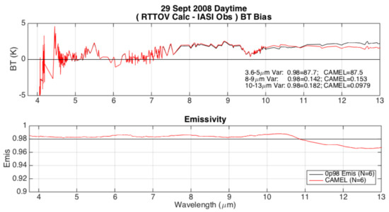 Differences between the calculated and observed IASI BTs are computed over the 616 channel set and separated by land classification type using the IGBP categories. The improper skin temperature determination can cause a bias in the BT calculation. This bias between ECMWF and IASI has a magnitude typically around 1–2 K in the Northern Hemisphere and 2–3 K in the Southern Hemisphere. To avoid it the de-biased variances of the calculated minus observed BTs differences for the 3.6–5, 8–9, and 10–13 µm spectral regions are used as indicators for a better emissivity estimate. To compute the de-biased variances for each spectrum, the IASI BT calculation minus observation difference is found and the result is then fitted to the 10.5–13 µm window region by subtracting the calculation minus observation 10.5–13 µm spectral domain average from the calculated spectrum. This de-biasing using the window region is assumed to only account for differences in skin temperature, though it’s possible that the de-biasing could account for other errors of lesser magnitudes such as inaccurate surface emissivity characterization and errors induced from the inclusion of cloudy scenes in the analysis. Three separate spectral variances over the 3.6–5, 8–9, and 10–13 µm regions are then computed for the window-fitted BT difference. Using this method, there are 3 separate variances computed for each IASI calculation. The de-biased variance statistics corresponding to the CAMEL and 0.98 emissivity are compared for different time and space domains by taking averages of the variances over the specific regions.