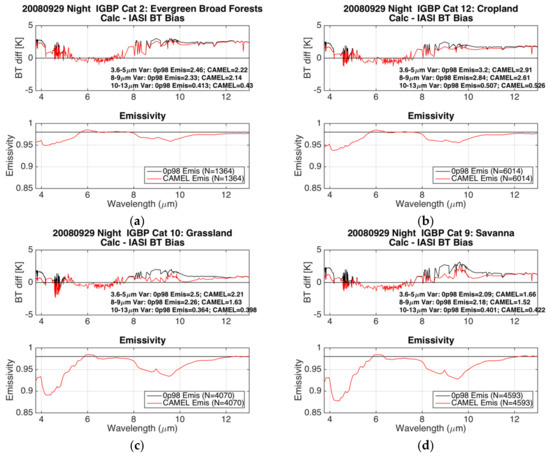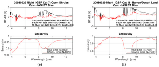 In addition to the 8–9 µm region, the 3.6–5 µm region of CAMEL also better matches the IASI observations than does the 0.98 constant emissivity. De-biased variances for CAMEL are overall lower than those for the 0.98 constant emissivity in the 3.6–5 µm region, with the exceptions being for cases with a low (e.g., less than 100) number of samples. The open shrub and barren/desert categories showed the most CAMEL improvement—the de-biased variances for CAMEL are decreased respectively to be ~79% and ~56% of the 0.98 emissivity de-biased variance.