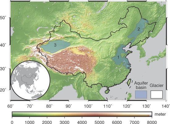 Map of China showing three main aquifer basins (i.e., (1) North China Aquifer System; (2) Song-Liao Basin; and (3) Tarim Basin). The boundaries of the three aquifers are based on the delineation of the world’s 37 large aquifer systems from the World-wide Hydrogeological Mapping and Assessment Programme (WHYMAP) [47]. The white areas denote glaciers from the Randolph Glacier Inventory (RGI 6.0) [48].