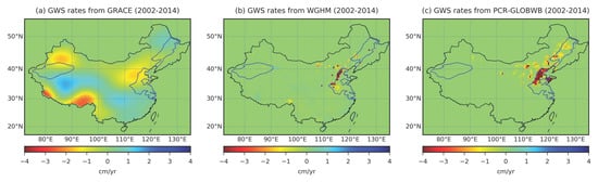 GWS rates over China from (a) GRACE; (b) WGHM; and (c) PCR-GLOBWB during 2002–2014. Blue lines highlight the three main aquifer basins in China.