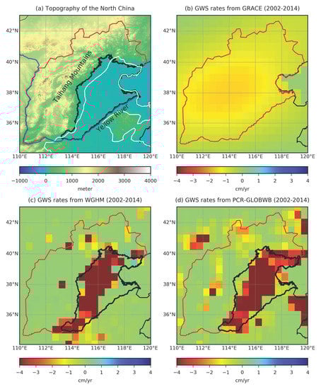 (a) Topography of the North China. The black boundary outlines the NCP. The red boundary shows the study region including the whole NCP and mountains in Hebei province and Shanxi province. The white line shows the boundary of the North China Aquifer System, same as Figure 1. The blue line shows the Yellow River. GWS rates from (b) GRACE; (c) WGHM; and (d) PCR-GLOBWB in the North China during 2002–2014.