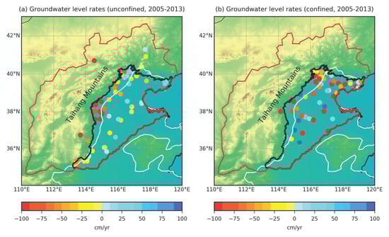 Figure 4a,b show groundwater level rates from 2005 to 2013 based on ground monitoring wells in the NCP from unconfined and confined aquifers, respectively. Significant groundwater declines in shallow unconfined aquifers are located in the piedmont region of the Taihang Mountains (Figure 4a); while the groundwater depletion in confined aquifers occurs over the whole plain (Figure 4b).