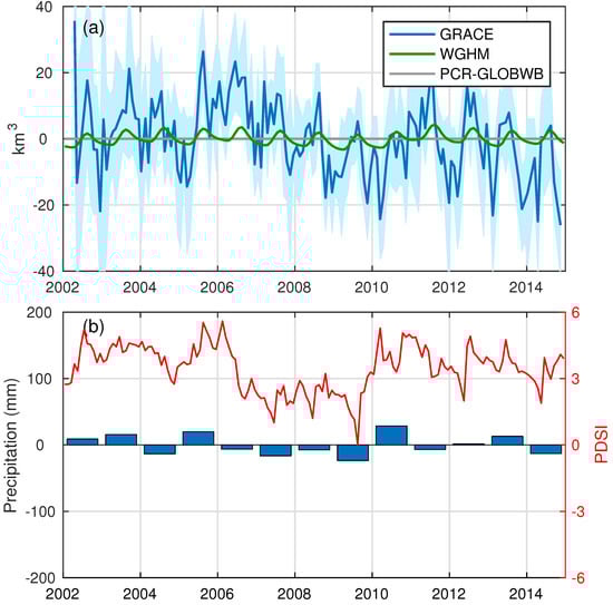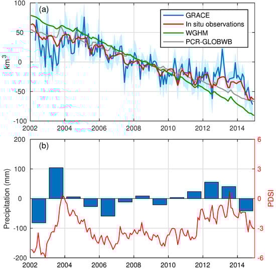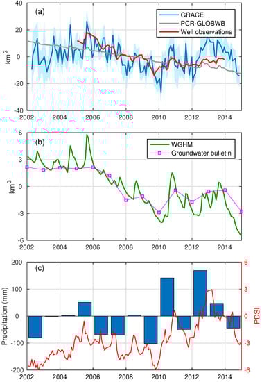 In addition, interannual variability of GWS from GRACE, well observations, WGHM, and groundwater bulletins agrees well with annual precipitation anomalies and PDSI over the LRB. As shown in Figure 7, during the drought conditions from 2006–2009, the GWS declined significantly. Due to more precipitation in 2010 and 2013, the groundwater recovered correspondingly as shown in results from GRACE and WGHM. PCR-GLOBWB, however, fails to simulate interannual GWS variations in the LRB well.