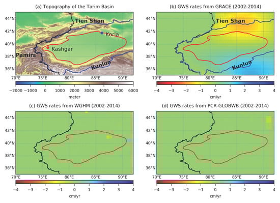 (a) Topography of the TRB and its surroundings. The red boundary outlines the plain region of TRB. The blue line shows the boundary of the TRB, same as Figure 1. Locations of two cities where well observations are available, i.e., Korla and Kashgar, are also shown. GWS rates from (b) GRACE, (c) WGHM and (d) PCR-GLOBWB in the TRB and its surroundings during 2002–2014.