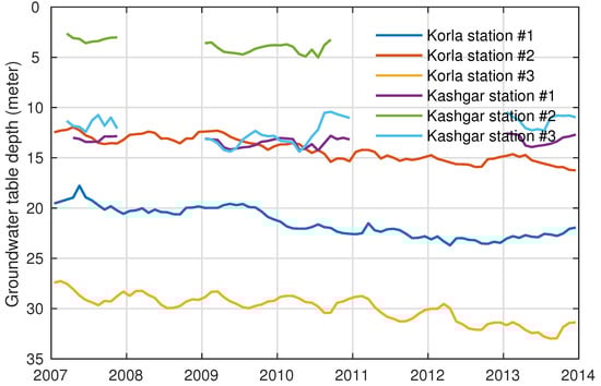 Unfortunately, there are few long-term monitoring well observations available over the TRB. Only three monitoring wells are located in Korla at the northeast of TRB, with groundwater level data available from 2007 to 2013. For the other three wells in Kashgar at the west of TRB, there are many gaps in groundwater level data. As shown in Figure 11, the groundwater tables are generally deeper in Korla than those in Kashgar. Steady groundwater level declines are observed in Korla at a rate of ~0.6 m/yr during 2007–2013 (Figure 11). Although there is no information on specific yields in the TRB to translate level changes into storage changes, the negative level rate from ground wells is consistent with the GWS decline from GRACE during the same period. Additionally, the well station #3 in Kashgar shows an obvious recovery of water level in 2010, which is also consistent with GRACE-based GWS results and positive annual precipitation in the same year.