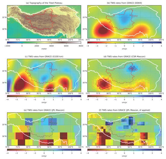 (a) Topography of the TP and its surroundings. TWS rates from GRACE during 2002–2014 based on CSR SH products with (b) the DDK4 filtering, (c) 100-km Gaussian smoothing applied, and based on (d) CSR mascon products, (e) JPL mascon products, and (f) JPL mascon products with gridded scaling factors applied. The white line shows the boundary of TP. The red boundary outlines the Inner TP.
