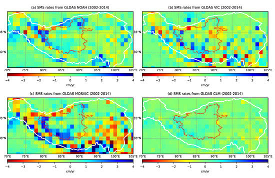 We take SMS changes in the TP from GLDAS LSMs as an example to demonstrate the uncertainties in models. Figure 13 shows the comparisons of long-term SMS rates from four versions of GLDAS. Although these four GLDAS LSMs adopt the same forcing data, there are still significant discrepancies among these model outputs. The magnitudes of SMS rates from MOSAIC are largest among four models; while the estimates from CLM are far less than those from other three models (Figure 13). The significant differences among them in the TP exemplify the uncertainties in GLDAS LSMs due to different parameterization schemes of land surface. Other reasons for large uncertainty in simulated SM over the TP could be the limitation of available ground hydrometeorological observations to constrain models in this region and the complexity of hydrologic processes among surface water, soil water, glaciers, snowpack, groundwater, and permafrost [111]. Especially, the TP contains the largest alpine permafrost area in the world [112]; while permafrost-related hydrologic processes still fail to be simulated in most global models, which will attribute to large uncertainty in models over the TP. Nearly all GRACE-related mass balance studies on the TP highly reply on hydrological models, only with which other components, e.g., surface water [113], glaciers [80,114], and groundwater [108], can be disaggregated from GRACE-observed total mass changes. Therefore, there would be potentially large uncertainties in these studies, due to imperfectly simulated hydrologic processes in models over the TP. It remains a challenge to quantifying GWS changes in the TP accurately. Fortunately, most of regions, where groundwater has been depleted significantly due to agriculture irrigation or other anthropogenic activities, are in arid or semi-arid plains. Therefore, non-groundwater storage changes and their errors from models are relatively small in these regions. Thus, GRACE along with ancillary models can still be used to estimate long-term GWS changes accurately in places where the contributions from other mass change components are relatively small.