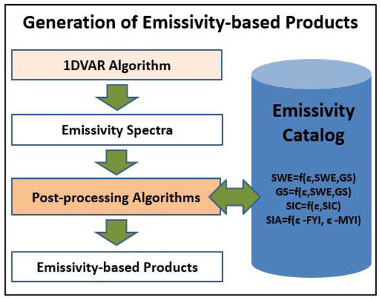 It is worth noting that the emissivity could be used directly as a proxy parameter to determine the degree of wetness over land, for instance. In MiRS, however, as mentioned earlier, the emissivity is further processed to produce more readily usable surface parameters, such as SIC and SWE. Figure 2 details this post-processing of the emissivity. It shows that the emissivity spectra as retrieved in the first step are compared to an offline-computed catalog of emissivity spectra for a range of values of the parameters to be derived.
