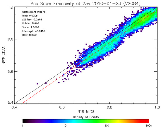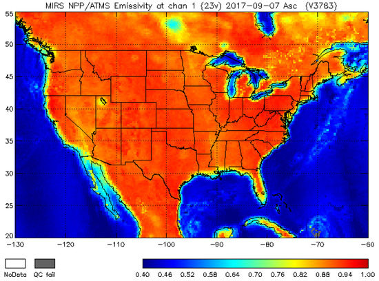 Another quantitative assessment methodology relies on inter-comparisons with other independently developed emissivities. This has been the subject of efforts led by others and has been reported in a number of publications [15,16,17] and therefore, will not be addressed here. Suffice to say that these comparisons highlight that MiRS emissivities are consistent with independently-generated emissivities.