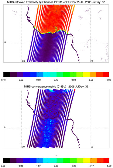Another qualitative example to emphasize the previous point is given in Figure 4. It represents the emissivity at the 31.4 GHz channel on the Advance Microwave Sensor Unit (AMSU) onboard the NOAA-18 satellite. It shows that the emissivity retrieved from MiRS transitions has low value over oceans and high values over land, as expected, with in-between transitional values on the coast and along water bodies, in this case the Volta Lake in West African Ghana. At the same time, the bottom panel in the same figure shows that convergence (fit to observations) was reached over land, ocean, and mixed-surface areas. The convergence metric shown there is indeed under unity, signaling that the solution found is within noise levels that are consistent with the radiometric measurements.