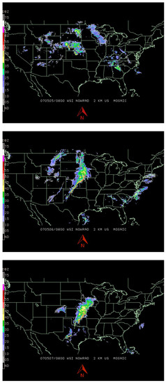 Rain storms in Midwestern US, as captured by NEXRAD radars during the period between 5 May (top), 6 May (middle) and 7 May (bottom), 2007.