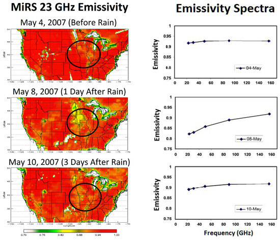 A significant storm system was recorded due to its wide-spread nature. These storms hit Midwestern US during 5–7 May 2007, as seen from NEXRAD Radar images in Figure 5. The MiRS retrieved emissivity spectra were qualitatively assessed for their behavior before, during, and after these rain storms. This is illustrated in Figure 6. In this figure, both a spatial map and a full spectrum are shown. The emissivity map relates to channel 1 (23.8 GHz) of the NOAA-18 AMSU. It was chosen for its higher sensitivity to the surface. The days of the measurements that were assessed are 4 May 2007 (a day before the rain event hit that area; dry surface); 8 May 2007 (a day after the storm had passed, where the surface was presumably still wet); and 10 May 2007 (three days after the event, where presumably, the surface had dried out). One can see clearly in Figure 6 that both the emissivity values and the spectral shape from the MiRS-retrievals behaved as expected. Indeed, the dry surface emissivity spectrum is almost flat with high values (4 May). This transforms into an almost water-like spectrum on 8 May, when the surface is wet in terms of both the absolute values and the shape of the emissivity spectrum. When the surface returns to its dry state, the emissivity spectrum again resembles the shape and magnitude from before the rain event (10 May).