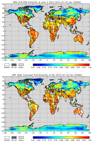 An example of the routine monitoring of MiRS retrievals is given in Figure 7, where the emissivity product is shown (the example shown is for emissivity over land). This figure shows two maps corresponding to MiRS retrieval at 50.3 GHz channel (top panel) and NOAA Global Data Assimilation System (GDAS)-based analytic emissivity (bottom). This shows that globally, MiRS-based emissivity retrievals are very similar to analytic emissivity, even if the two methods are different and computed entirely independently. It is worth mentioning that the analytic emissivity computed here obviously cannot be applied in real-time since it depends on NWP analyses. It can only be used as a source of verification and validation.