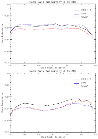 An additional important assessment was made to verify the expected angle dependence of the emissivity retrieved by MiRS over surfaces known to have specular features that cause the dependence of emissivity on the viewing angle (from cross-tracking sensors). Figure 9 shows the angle dependence of the emissivity retrieved with MiRS by comparing its scan dependence with those computed from both GDAS and ECMWF analytical emissivities with the AMSU 23.8 GHz channel. The top plot presents the mean emissivities over snow-free land as a function of the scan angle. The MiRS retrieved emissivity appears to compare more favorably to the GDAS emissivity, while the ECMWF-based emissivity demonstrates a negative bias of about 0.01. The bottom figure shows the mean emissivities over snow-covered land as a function of the scan angle. Here, the MiRS-retrieved emissivity contains about a 0.015–0.020 bias relative to both GDAS and ECMWF, which have almost identical means. It is important to note that in MiRS, no bias corrections were applied over land (all non-ocean surfaces) to the brightness temperatures used in this retrieval, which could explain some of the biases found in the emissivity (of either MiRS or analytic emissivities). Angle dependence is also likely a mixture of natural emissivity variation over partially specular surfaces, but also sensor calibration that is not uniform across all angles. This explains, at least partially, the lower emissivities at the scanline edges. The main conclusion that can be drawn from this assessment is that MiRS captures, within reason, the angle dependence, through the analytical emissivity. Keep in mind that these emissivities are not instantaneous—they are averaged over large areas and therefore combine different surface sub-types. For example, over land, forest, desert, bare land, rivers, and urban surface types are included.