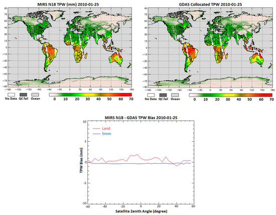 Another example is shown in Figure 11, which highlights TPW as one of the parameters that benefit indirectly from the simultaneous retrieval of emissivity. Indeed, because the emissivity is dynamically retrieved in the same 1DVAR algorithm as the atmospheric parameters, it is possible to extend the retrieval of TPW over non-ocean surfaces with microwave sensors. The methodology and extensive validation of this process was done in [18]. Figure 11 compares MiRS-based TPW over land to that from the GDAS, and their differences are stratified by zenith angle for snow-free and snow-covered surface types.