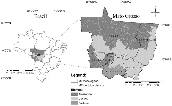 Geographic location of the State of Mato Grosso, Brazil, with its mesoregions and biomes. Source: Brazilian Institute of Geography and Statistics (IBGE) (2017).