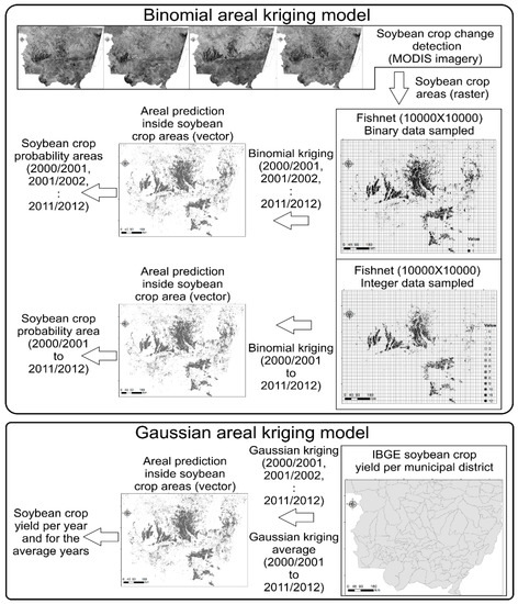 Binomial areal kriging was used to generate maps of soybean areas in Mato Grosso, presenting the probability of soybean occurrence over the years. Gaussian areal kriging was used to predict the crop yields of soybean areas detected by remote sensing, having a downscaling effect on the results. The global accuracy and the Kappa index values for soybean crop detection were 92.1% and 0.84%, respectively. The yield prediction presented 95.09% accuracy considering the standard deviation and the probable error. The validation phase confirmed this accuracy rate and revealed the uncertainties of the classification. The higher accuracy values show that the MODIS eight-day composite time series data performs best for the discrimination of crops with a similar phenology, because the higher temporal resolution allows subtle spectral–temporal differences between crop types to be detected, improving identification.