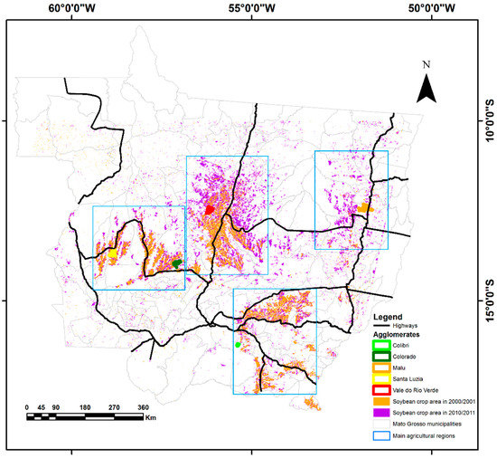 The soybean crop expansion occurred in four main agricultural regions: (1) along the BR-163 highway that links Cuiabá to Santarém (State of Pará); (2) on the Parecis plateau, in the western region, including Sapezal and Diamantino; (3) the eastern region, near Santo Antônio do Leverger and Querência; and (4) the southeastern region, near Rondonópolis and Primavera do Leste. In this context, five agglomerates with high soybean production were chosen for the validation: Vale do Rio Verde (northern region, in Tapurah/Ipiranga do Norte); Santa Luzia and Colorado (western region, in Sapezal and Diamantino, respectively); Malu (eastern region, in Bom Jesus do Araguaia/Ribeirão Cascalheira); and Colibri (southeastern region, Santo Antônio do Leverger) (Figure 3).