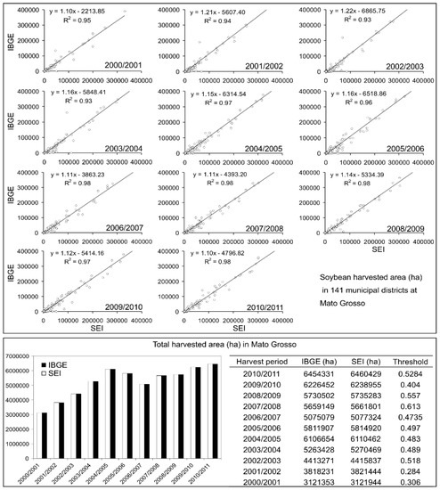 The for each crop season was classified into binary (0 and 1) values, where 0 and 1 were “Non-soybean” and “Soybean” cropland, respectively. The threshold values for the classification were defined based on the time series responses and on the Brazilian Institute of Geography and Statistics (IBGE) survey of soybean crop production and harvested area [28] for all of the crop seasons in all of the Mato Grosso municipalities. The harvested soybean crop areas estimated by the were recorded and compared with the IBGE survey, defining the best threshold values based on the highest similarity between the “Soybean” and “Non-soybean” cropland classification results of both surveying methods.