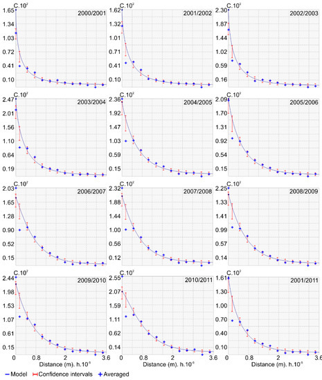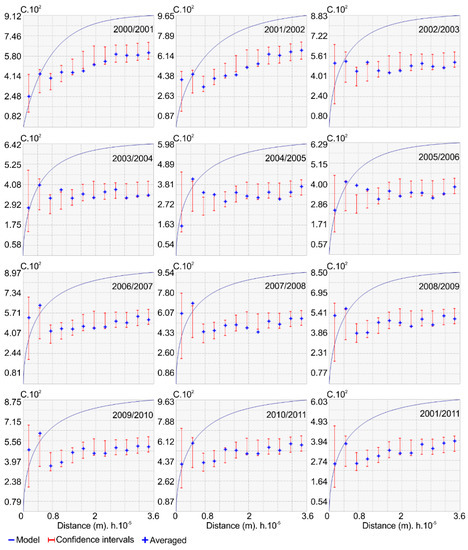 where and is defined as the semivariogram function of the risk of soybean crop area occurrence; is the semivariogram function of the rates; and n(ui) and n(uj) are the total number of soybean crop areas in the i-th and j-th geographic supports, with centroids in ui and uj, respectively. The average risk µ is E[R(u)]. The risk variances in the i-th and j-th geographic supports are and , respectively. If the variogram is bounded by a finite value γ(∞), a covariance function can be found, such as [31]:
