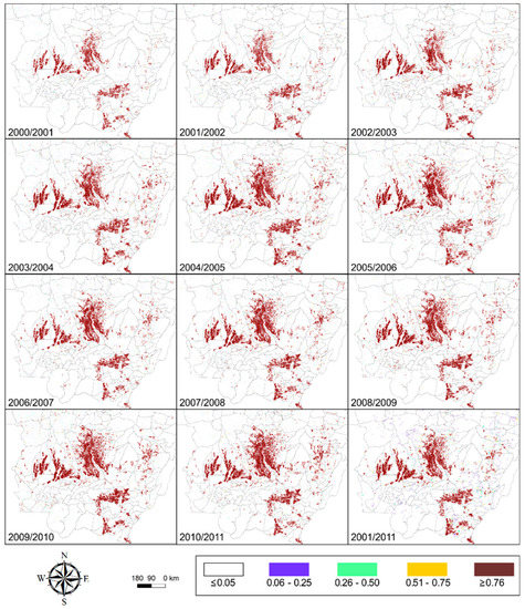 Binomial kriging can be considered a noise filter for generating maps of regional patterns, such as information about the concentration of soybean-harvested areas. This result can be observed in the map of the averaged years, where sparse areas present a low probability of soybean occurrence, due to less agricultural intensification over the years, compared to consolidated agroecosystems (Figure 7). Galford et al. [19] used a wavelet analysis of eight-day MODIS time series data as a filtering approach to detect crops in Mato Grosso, but they left a gap in relation to the determination of uncertainties. The binomial kriging results are promising for the determination of spatial prediction uncertainties as well as for soybean mapping.