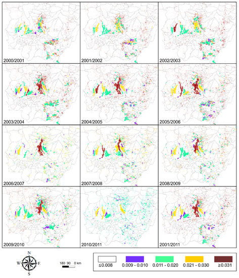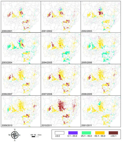 The yield results show that increasing yield was not directly correlated with area expansion. Arvor et al. [16] explained that agricultural intensification has evolved rapidly in Mato Grosso, particularly the proportion of the net planted area cultivated with double-cropping systems and producing two successive harvests of commercial crops. Rudorff et al. [21] categorized the expansion into previously deforested areas in Mato Grosso as a process that was encouraged by the Soy Moratorium established by producers, non-governmental organizations (NGOs), State administrations, and private enterprises. Sentelhas et al. [37], Arvor et al. [16] and Dubreuil et al. [47] explained that the impact of soybean expansion on deforestation in Mato Grosso was indirect, as the deforested areas were first converted to pasture before being used for soybean production.