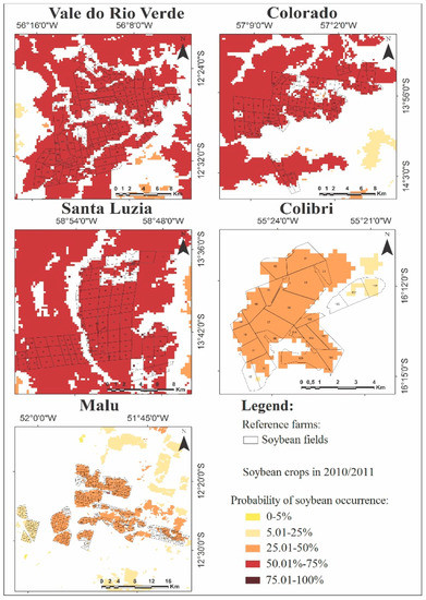 The results for the agglomerates reveal a high alignment between the in situ data and the classification achieved by the . The classification presented a probability of soybean occurrence of 50–75% for the Vale do Rio Verde, Santa Luzia, and Colorado agglomerates, and 25–50% for Malu and Colibri. Geographic location may explain this variation: Malu is in the eastern part of the State, and Colibri is in the south. In addition to their agricultural areas, both of these regions have extensive pasturelands, which show seasonal variation in satellite images. This factor may have caused spectral confusion by reducing the algorithm’s accuracy in capturing the areas of soybean crop fields. The Vale do Rio Verde, Santa Luzia, and Colorado agglomerates are located in the mid–west portion, which is known as the agribusiness region [54], with most of these areas devoted to soybean production [8]. The resulting uniformity of development limits the spectral confusion from mixed pixels, and allows better soybean crop detection.