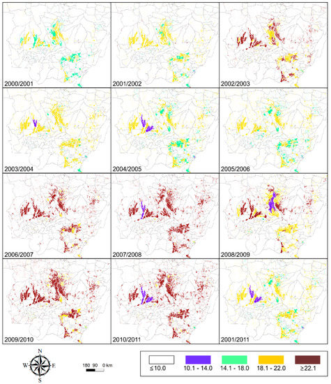 The Mato Grosso municipalities vector boundaries—2007 reference year, 1:2,500,000 scale, SIRGAS 2000 geographic latitude and longitude—were obtained from IBGE [14]. The vector boundaries were converted to WGS84 geographic latitude and longitude. The vector boundary zones for each of the 141 municipalities corresponded to the harvested area and yield data obtained for the 2000/2001 to 2011/2012 crop seasons. Zonal statistics were used to calculate the number of soybean crop pixels, according to the , inside each vector boundary zone of the 141 municipalities.