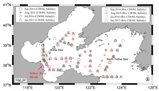 Strong linear relationships between salinity and CDOM have been found in previous studies [9,21,25,55]. These relationships are likely to be influenced by river discharge, especially near estuaries. There are two sources of CDOM in waters, terrestrial CDOM and autochthonous CDOM. The former’s source is river discharge, while the latter is released as in situ products related to different oceanic phenomena, such as the photosynthetic processes of phytoplankton [56]. Several main rivers, including the Yellow, Haihe, Luanhe and Liaohe rivers, discharge into the BS [57]. Therefore, the obtained strong correlation between salinity and CDOM in the coastal regions of our study area were regarded as being due to terrestrial CDOM discharge [19,20,22].