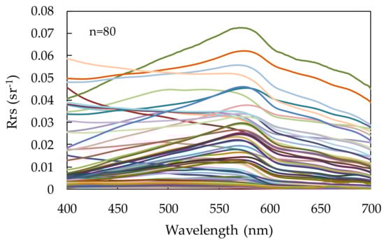 The collected Rrs spectra in this study are shown in Figure 2. The spectral reflectances were shown to be highly variable and were similar in magnitude to the typical reflectance spectra of the turbid waters [46]. Owing to the phytoplankton pigment and the CDOM absorption, the reflectance was low over 400–500 nm. In particular, in coastal regions such as the BS, the effect of particle absorption will result in a lower down reflectance at 400–500 nm. The peak reflectance at 555 nm is due to weak absorption by phytoplankton and strong scattering by sediment.